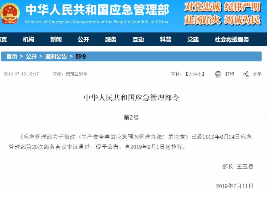 應急管理部關于修改《生產(chǎn)安全事故應急預案管理辦法》的決定 為貫徹落實十三屆全國人大一次會議批準的《國務院機構改革方案》和《生產(chǎn)安全事故應急條例》《國務院關于加快推進全國一體化在線政務服務平臺建設的指導意......