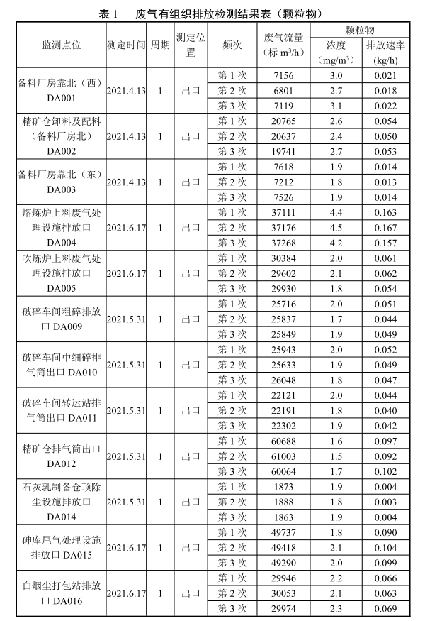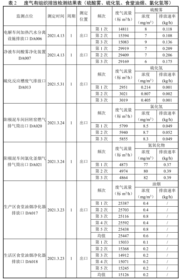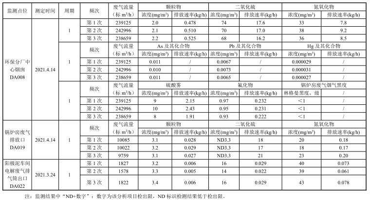 由表1-表3可知,DA001、DA002、DA003、DA004、DA005、DA009、DA010、DA011、DA012、DA014、DA015和DA016排氣筒出口廢氣顆粒物排放濃度均能滿足《銅、鎳、鈷工業(yè)污染物排放標(biāo)準(zhǔn)》(GB 25467-2010)(2013修改單)中排放限值要求。DA006、DA007和DA013排氣筒出口廢氣排放濃度均能滿足《銅、鎳、鈷工業(yè)污染物排放標(biāo)準(zhǔn)》(GB 25467-2010)(2013修改單)和《黃金冶煉行業(yè)污染物排放標(biāo)準(zhǔn)》(DB41/2088-2021)中排放限值要求;DA017和DA018排氣筒出口廢氣排放濃度均能滿足《餐飲業(yè)油煙污染物排放標(biāo)準(zhǔn)》(DB41/1604-2018)中排放限值要求;DA020排氣筒出口廢氣氯化氫和DA021排氣筒出口處廢氣氮氧化物的監(jiān)測(cè)結(jié)果均能夠滿足《黃金冶煉行業(yè)污染物排放標(biāo)準(zhǔn)》(DB41/2088-2021)中排放限值要求。鍋爐廢氣顆粒物、二氧化硫和氮氧化物監(jiān)測(cè)結(jié)果能夠滿足《鍋爐大氣污染物排放標(biāo)準(zhǔn)》(DB412089-2021)燃?xì)忮仩t排放限值要求;DA008排氣筒出口廢氣排放濃度均能滿足《銅、鎳、鈷工業(yè)污染物排放標(biāo)準(zhǔn)》(GB 25467-2010)(2013修改單)表1標(biāo)準(zhǔn)排放限值要求;DA022排氣筒出口處廢氣顆粒物、二氧化硫和氮氧化物的監(jiān)測(cè)結(jié)果均能夠滿足《黃金冶煉行業(yè)污染物排放標(biāo)準(zhǔn)》(DB41/2088-2021)中排放限值要求。