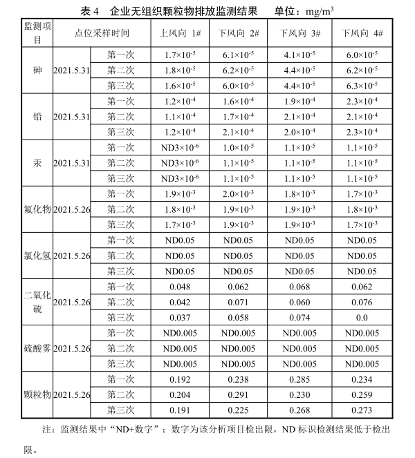 由表4可知,無(wú)組織廢氣顆粒物、二氧化硫、硫酸霧、氯化氫、氟化物、砷、鉛和汞廠界上、下風(fēng)向檢測(cè)結(jié)果均能滿足《銅、鎳、鈷工業(yè)污染物排放標(biāo)準(zhǔn)》(GB 25467-2010)表6標(biāo)準(zhǔn)限值要求。