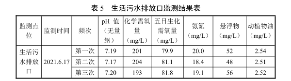 由上表可知,生活污水排放口中pH、化學(xué)需氧量、五日生化需氧量、懸浮物、動(dòng)植物油監(jiān)測(cè)濃度均能滿足《污水綜合排放標(biāo)準(zhǔn)》(GB8978-1996)三級(jí)標(biāo)準(zhǔn)限值要求;氨氮監(jiān)測(cè)結(jié)果能夠滿足《污水排入城鎮(zhèn)下水道水質(zhì)標(biāo)準(zhǔn)》(GB/T31962-2015)表1中B級(jí)標(biāo)準(zhǔn)限值要求。