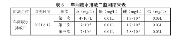 由上表可知,車間廢水排放口中總汞、總鎘、總砷、總鉛監(jiān)測(cè)結(jié)果均符合《銅、鎳、鈷工業(yè)污染物排放標(biāo)準(zhǔn)》(GB25467-2010)(2013修改單)水污染物特別排放限值要求。