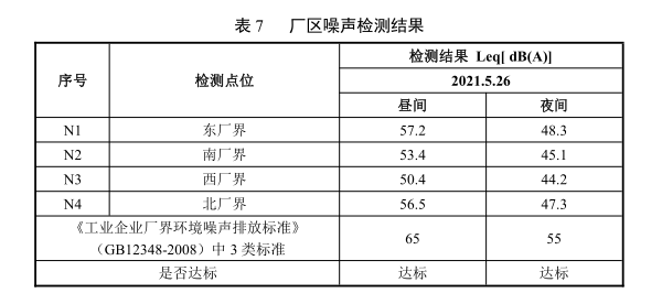 由上表可知,企業(yè)廠區(qū)晝間、夜間廠界噪聲排放均滿足《工業(yè)企業(yè)廠界環(huán)境噪聲排放標(biāo)準(zhǔn)》(GB12348-2008)中3類標(biāo)準(zhǔn)限值要求,企業(yè)噪聲達(dá)標(biāo)排放。