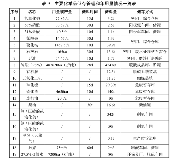 國(guó)投金城冶金有限責(zé)任公司在生產(chǎn)過(guò)程中涉及的化學(xué)品主要為硫酸、硝酸、鹽酸、氫氧化鈉、天然氣等,主要化學(xué)品儲(chǔ)存狀況和年用量見(jiàn)下表: