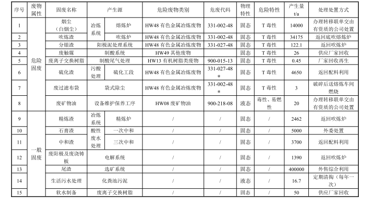國(guó)投金城冶金有限責(zé)任公司生產(chǎn)過(guò)程中產(chǎn)生的固體廢物主要有尾渣、吹煉渣、精煉渣、分銀渣、制酸轉(zhuǎn)化工段廢觸媒、污酸及酸性廢水處理站硫化渣、石膏渣、廢離子交換樹(shù)脂、廢過(guò)濾布袋、生活污水處理污泥及各除塵器回收白煙塵。公司建立有危廢暫存間與一般固廢暫存間,全部進(jìn)行了有效處置或綜合利用。具體固廢產(chǎn)生量及處理處置情況見(jiàn)表8。